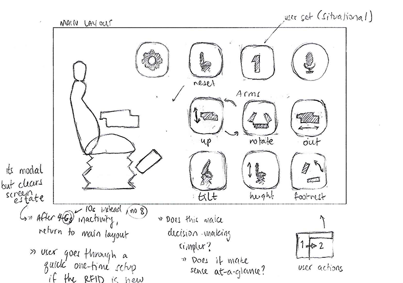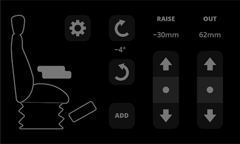 The brief required me to focus on automation for an operator chair. It was to be obvious and easy to use, and take up only one 7" touch screen of 800×480px resolution. During my meeting with Connectitude I got to hear some of their thoughts concerning the project. It was an challenging task as KLAB were initially thinking that buying a bigger screen would be the solution for accommodating over 30 buttons/settings.