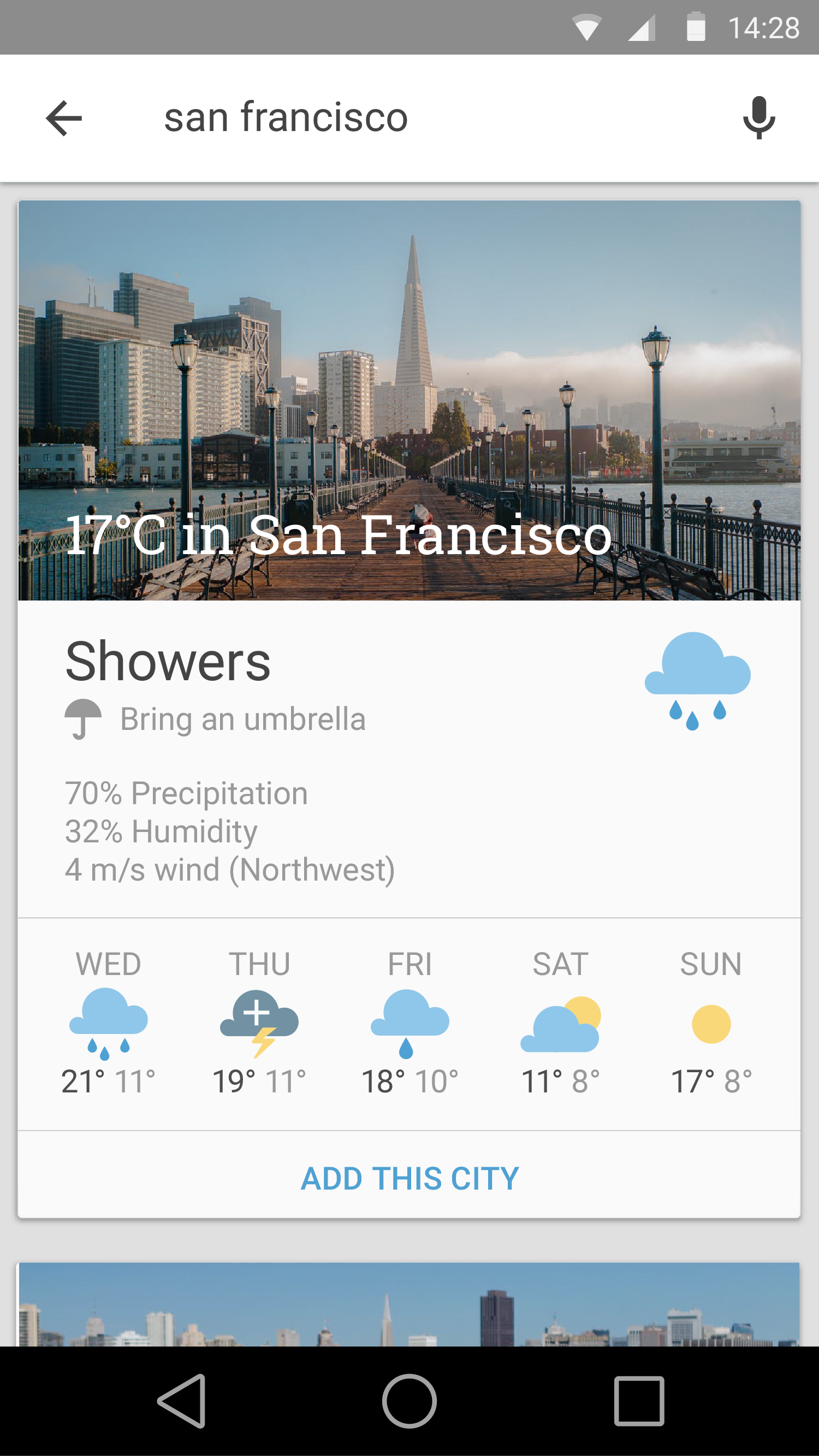 In a way I was a bit too intimidated to explore this idea further for the exercise. If I have, I would probably also add an overlay on top of the card which allows the user to see the recommended garb to wear. This would allow for advertisements to show fashion accessories appropriate to the season, or even just the necessities if there was a certain weather state. If the user gives input to these recommendations, it could help the user further in future once it understands what the user prefers more.