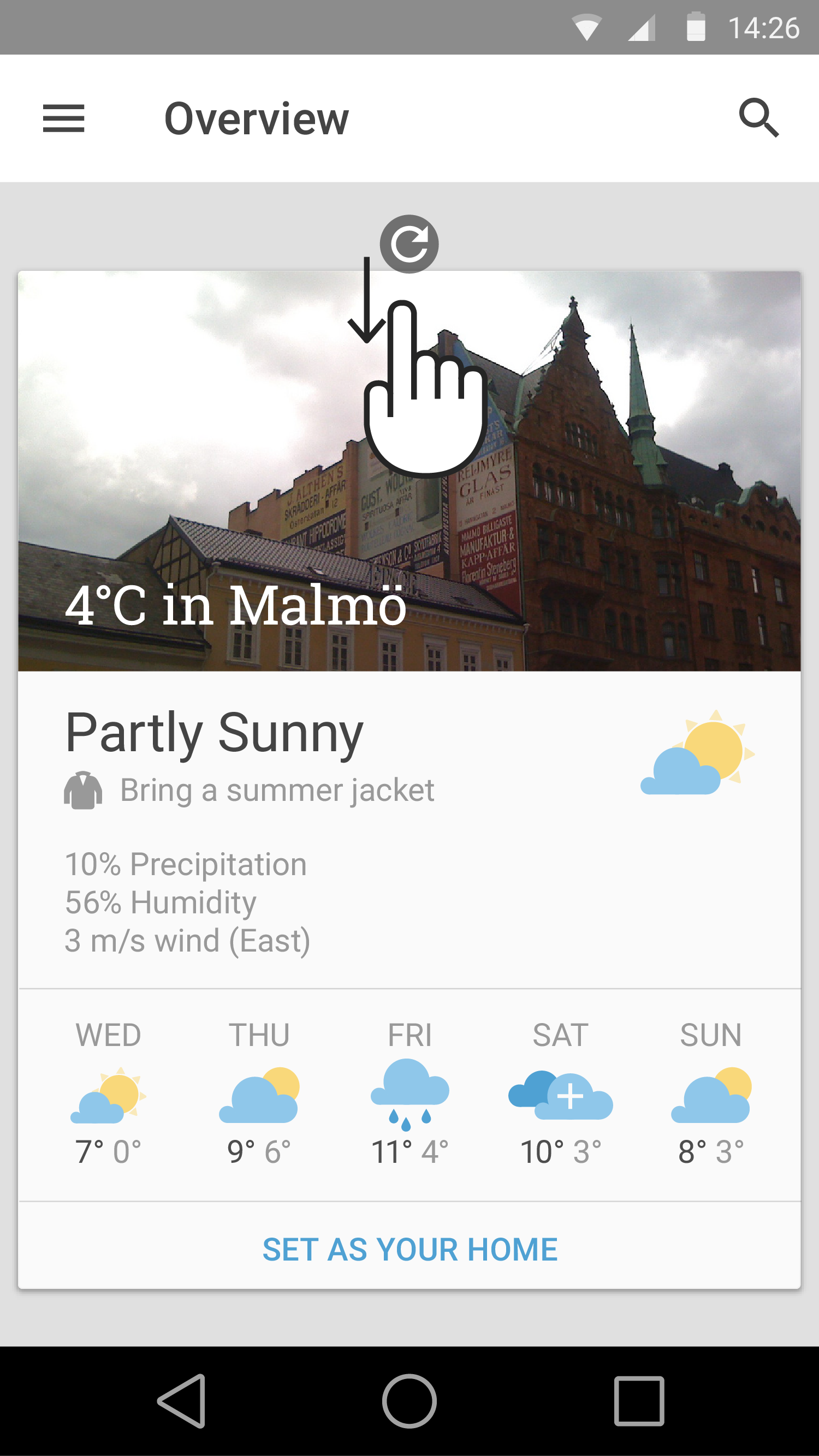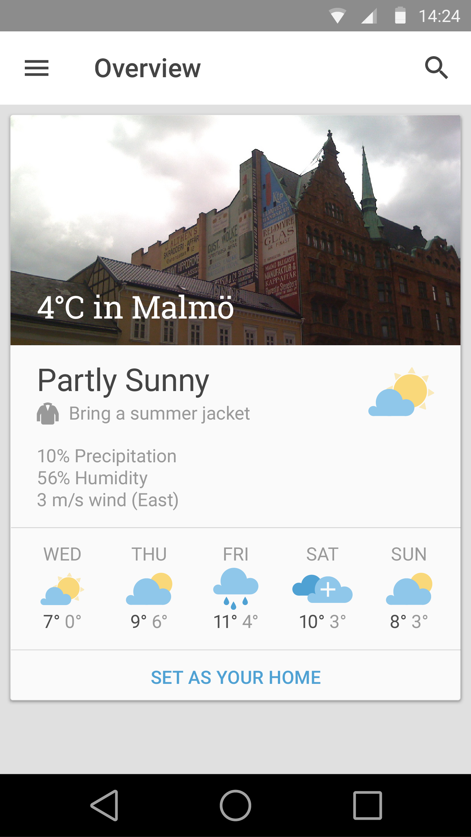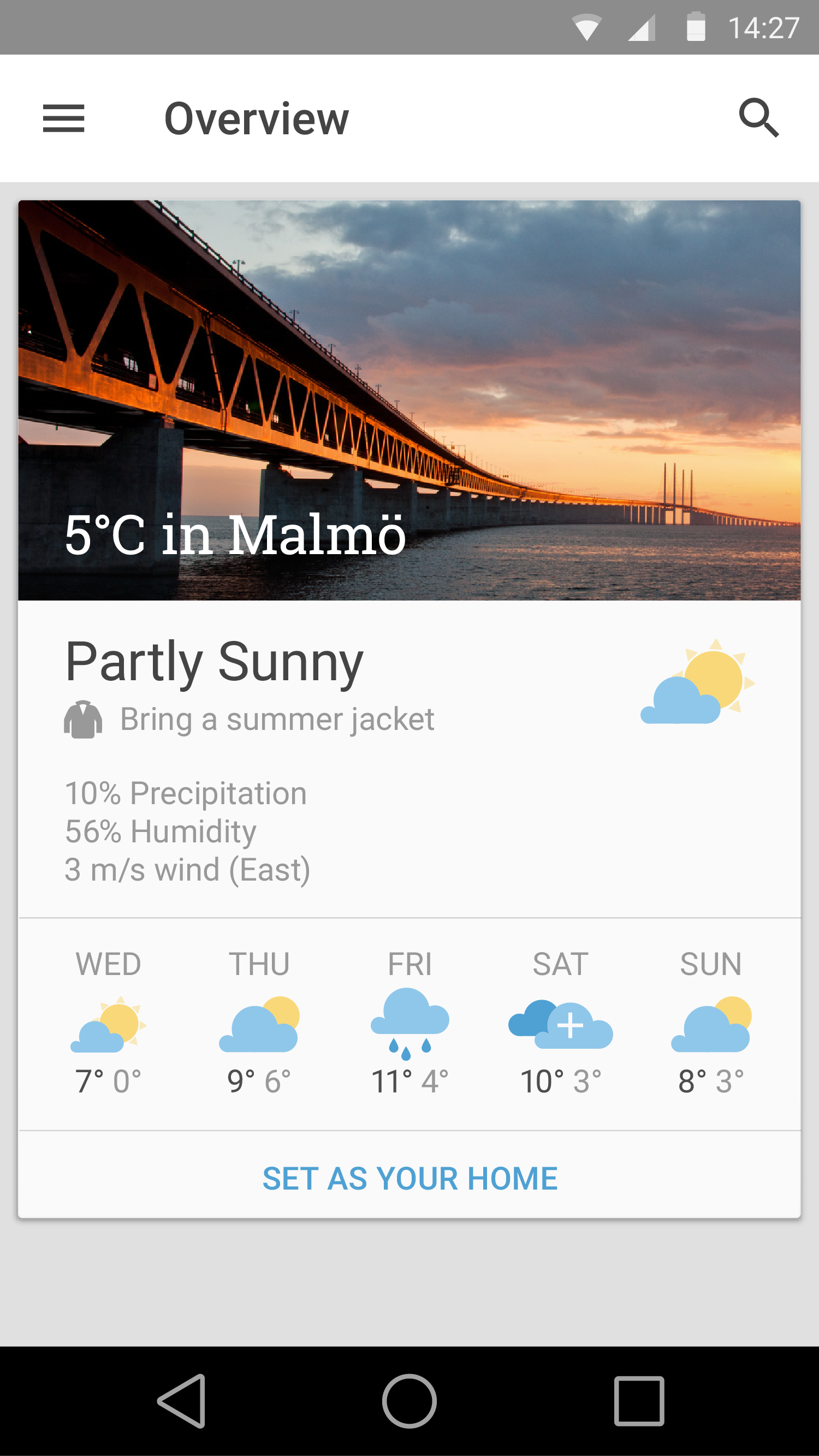 I made a lot of considerations about context and how a weather app should be used if I was given this task today. A lot of the common features is something I desire myself in a weather app. Though it was clear this type of exercise will never result in any real product as there is an abundance of weather apps out there. So I tried to bring forth some ideas which make a weather app interesting yet still relevant.