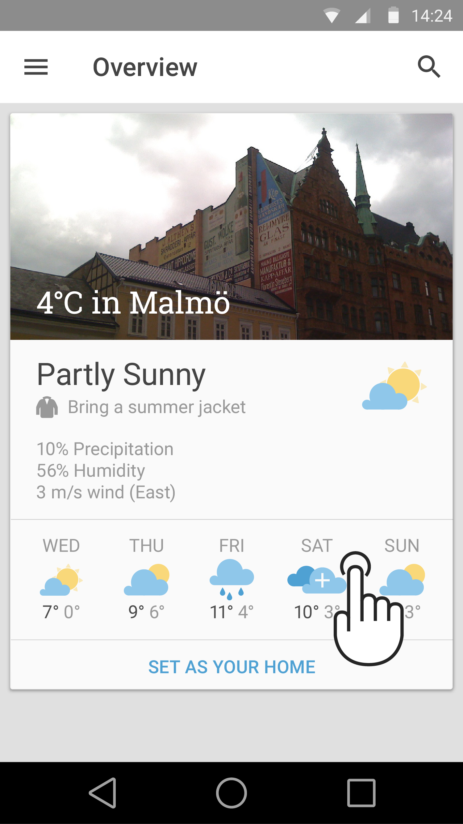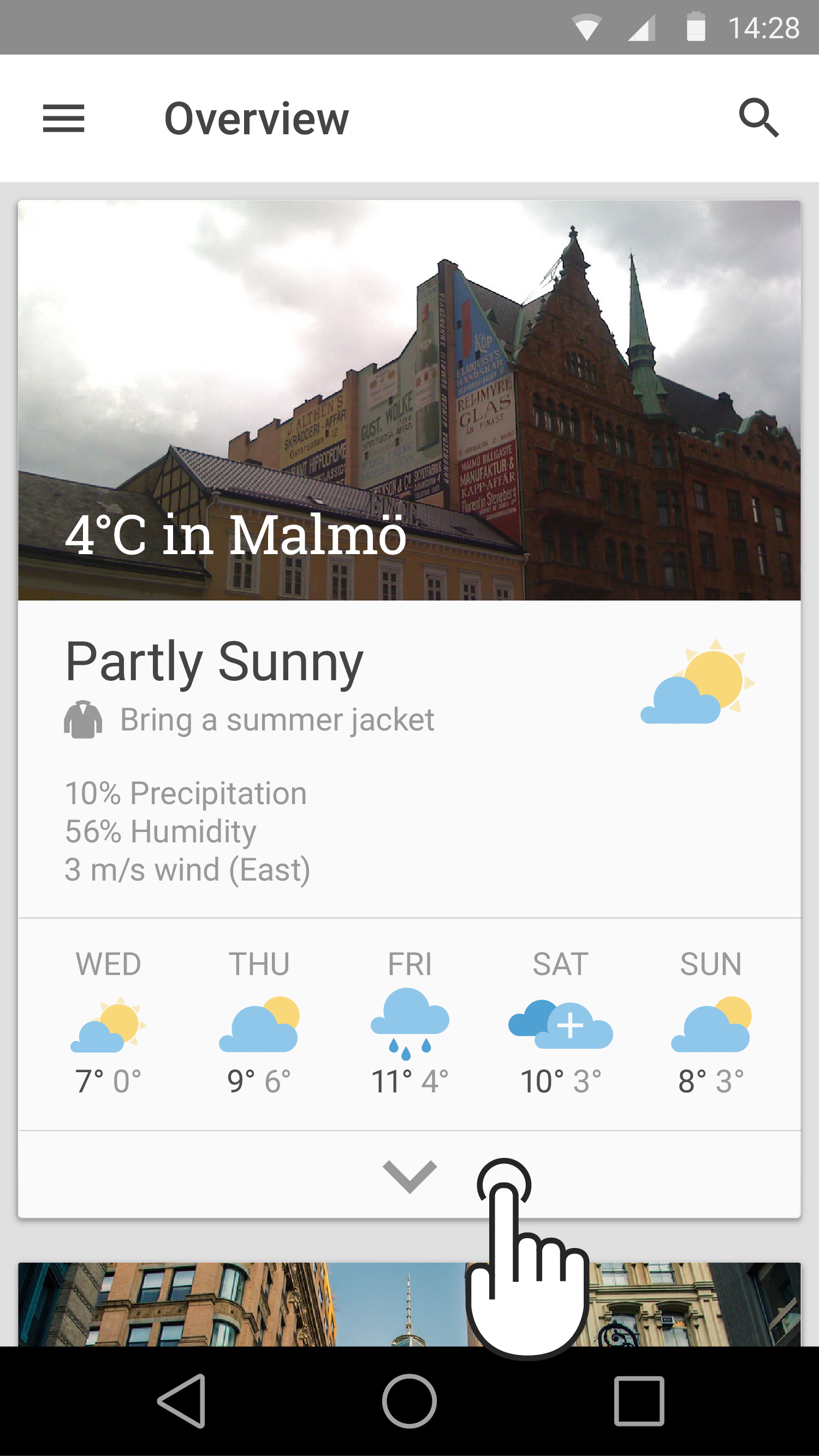 I made a weather app design as a design exercise for Sony. It is inspired by Material Design as that was a requirement of the brief.