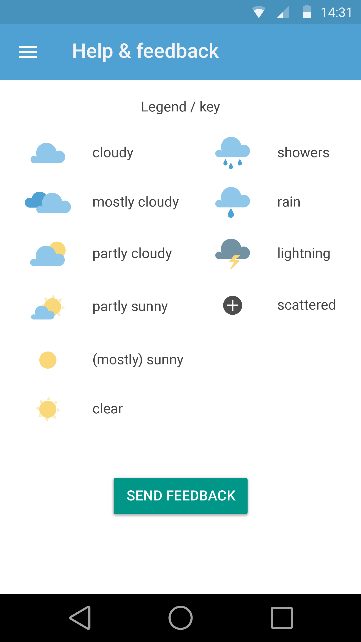 Though it was not asked of me, I felt like it was good to revisit the icons used to depict each of the weather states. The legend of these effects are shown in the Help & feedback section, displaying 9 different states and a 'scattered' modifier to indicate a difference in cloud cover to expect.