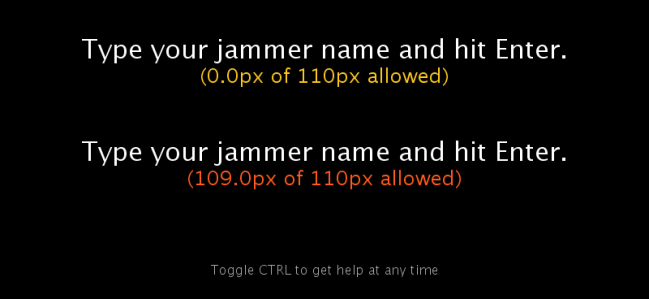 I also had fun designing around a playful constraint which involved limiting input in pixels and the layout as a whole. The jammer name screen introduces this concept of being limited/concise, as the username is limited by input length.